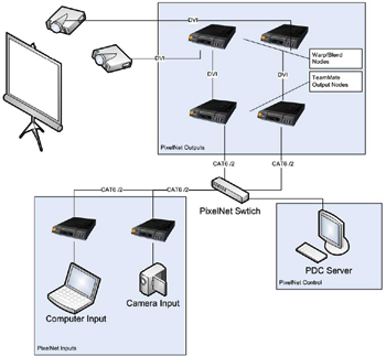 Warp/Blend節點為PixelNet開啟了使用投影機的多樣化應用,包括仿真與培訓、指揮與控制中的無縫顯示屏幕、會議室、以及數字標牌等安裝。