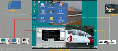 二、任意跨屏漫游:4投影單元拼接后,擴展運用RGB/視頻并行處理技術及投影單元的多畫面顯示技術,不需要外置圖像處理器就可以全墻顯示一路RGB底圖信號和以開窗口方式同時顯示4路視頻信號及4路RGB信號,窗口信號可以任意跨屏、放大移動,并能對任何一路信號局部放大。(圖2)