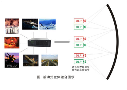 利用光學偏振原理,一般要求一組水平的投影機,通過光路疊加作圖像融合。即采用兩臺投影機同步播放圖像,將兩臺投影機前偏光片的偏振方向互相垂直,使產生的兩束偏振光的偏振方向也互相垂直,偏振光投射到專用投影幕上,再反射到觀眾位置,觀眾通過偏光眼鏡每只眼睛只能看到相應的偏振光圖像,從而在視覺神經系統產生立體感覺。就如在觀看《泰坦尼克號》影片時,被動3D讓觀眾體驗到“海水溢出銀幕,淹進了影院”的感覺,同時出色的3D使“影片后半段悲愴的基調提升到極致”!