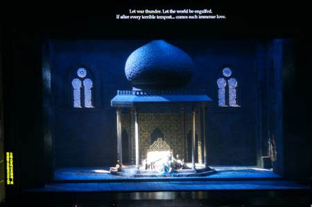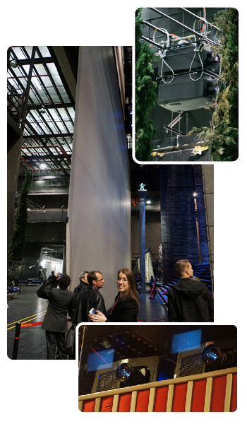 在大劇院現場,該負責人向媒體介紹了《奧賽羅》的劇目場景搭建情況。該劇場可容納2400人,三層樓高。舞臺采用了24米*14米大型天幕,由4臺巴可R22+投影產品完成2*2兩組疊加背投,同時使用2臺巴可HD20產品疊加正投,投影于紗幕,整個劇目演出通過WATCHOUT軟件控制投影機對動態視頻的多元精準投放,營造出夢幻般的壯觀景象。
