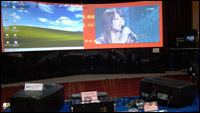 主會(huì)場(chǎng)的演講臺(tái)使用兩臺(tái)巴可高清系列HD8投影機(jī)和美國(guó)艾恩的弧形幕,在邊緣融合器的配合下,形成了一張亮度極高的高清會(huì)議演示墻。在主會(huì)場(chǎng)進(jìn)口處擺放了美國(guó)艾恩最新的玻璃背投幕,在巴可高清投影機(jī)R10+和POLYCOM高清攝像頭的配合下,