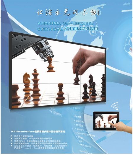 | ICT SmartPerform多媒體互動演示系統(tǒng)可用于LCD、PDP和投影顯示屏,支持多點(diǎn)觸摸,且不受任何硬件設(shè)備局限,而且可以通過iPad或是平板電腦對大屏幕進(jìn)行操控。ICT