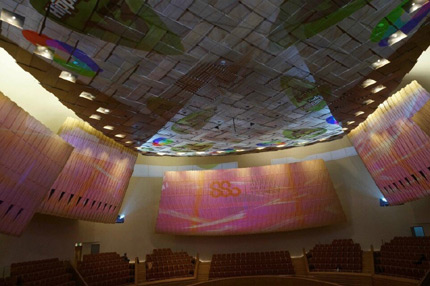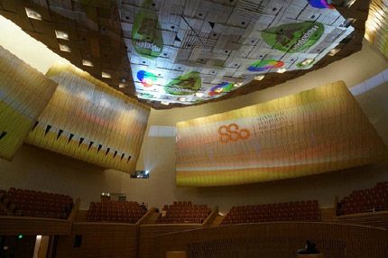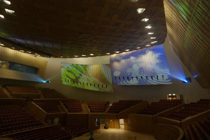上海交響樂團音樂廳由日本新磯崎工作室負責總設計,目標是建設中國最專業的交響樂大廳,讓中國的交響樂廳和世界接軌。應上海交響樂團方面的要求,建成后的音樂廳在演奏交響樂時,整個大廳頂部和四周播放大幅畫面要和現場音樂相結合,達到美輪美奐的效果。在反復現場測量,修改光路圖后DET德浩選擇了合適的機型和安裝位置,由于音樂廳頂部反聲板很大,安裝條件有所限制。音樂廳分為大廳和小廳,最終大廳使用了10臺巴可工程投影機來營造現場環境氛圍,其中4臺巴可HDF-W26做融合投影頂部反聲畫面,2臺