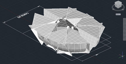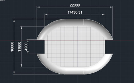 為了營(yíng)造全包圍的沉浸式體驗(yàn),項(xiàng)目要求完成“U”形電影院的設(shè)計(jì)制作,并以地面投影和環(huán)形投影模擬天地相連的環(huán)境,以強(qiáng)烈的視覺震撼帶領(lǐng)游客進(jìn)入翡翠的神秘世界。根據(jù)博物館方要求,U形幕尺寸要求為22m×16m×4.2m,內(nèi)側(cè)過渡圓弧半徑2.1m,四邊圓弧半徑9m(外側(cè)),要求留有一個(gè)4.2m×4.2m的入口。