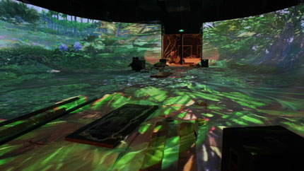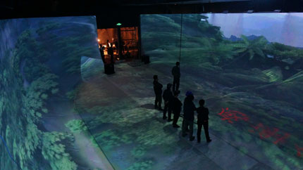 W12投影機(jī)。以地面投影和環(huán)形投影兩部分,通過邊緣融合技術(shù)組合成整屏,營(yíng)造天地一體的整體視覺效果。