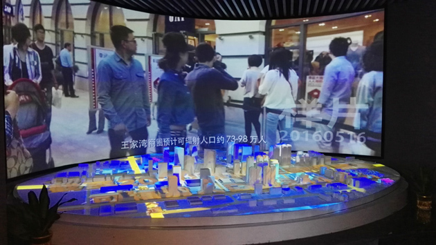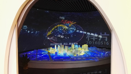 DET結合紐賓凱樓盤展示的需求,為其定制了最先進的數字沙盤激光工程投影解決方案,即是以計算機技術為核心的現代高科技手段生成逼真的三維圖像模型,借助投影顯示設備或其他顯示設備把計算機上的三維或四維圖形圖像模型顯示到臺面上。該項目由六臺S65WU激光工程投影機組成,其中4臺用于投影沙盤、2臺用于投影環幕,通過聲、光、電、圖像、三維動畫以及計算機程控技術與實體模型相融合,充分體現展示“漢•City”的特點,達到一種惟妙惟肖、變化多姿的動態視覺效果。對參觀者來說是一種全新的體驗,并能產生強烈的身臨其境之感。