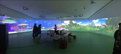 配合多人交互軟件、各種兒童主題交互動畫軟件,通過墻面投影互動游戲,以海底世界為主題,營造 3D