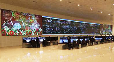 排控制臺。經(jīng)過仔細測量,中達電通選用了一套5行40列60英寸的DLP大屏幕拼接顯示系統(tǒng),成為截止目前為止亞洲地區(qū)最大規(guī)模的DLP拼接顯示屏。