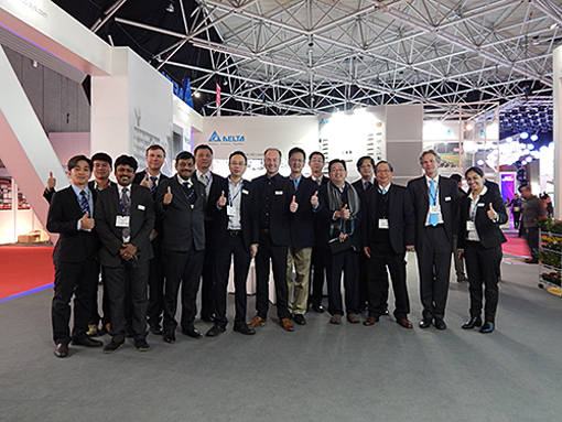 DSBU總經理傅潔(中左)、Vivitek歐洲區總經理Holger(中)及印度區業務營銷處長Hemant(左五)與DSBU同仁們于ISE展場前合影。
