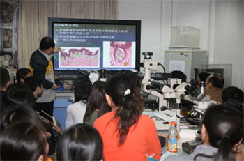 [投影之窗消息] 近日,在廣州某醫院皮膚科國際研究生班課堂上,一臺新的教學設備成為課堂中的焦點。該設備大屏幕高清晰的顯示效果,能夠非常清晰地顯示出皮膚病理切片在顯微圖像中的每一個細節;屏幕觸摸操作與書寫,用手指即可在屏幕上或拖動或縮小或放大顯示圖像,從而定位皮損部位并了解皮損特征;快捷的文件導入,無論是顯微鏡下的真實病理切片、影像、照片或者是病歷與檢驗報告,都能夠通過該設備連接的數字顯微鏡、視頻展臺、攝像頭將文件直接調用到屏幕上顯示和標注講解;實時啟動的遠程會議,還能夠隨時提供遠程的視音頻、病理圖片、以及數據文件的在線傳輸等等。這個高度智能化的教學設備正是VTRON智能會議通產品,經過VTRON公司與廣州某醫院近半年多的合作研究,成功地將VTRON智能會議通產品與醫院的醫學教學、病理遠程診斷等業務工作緊密結合,開創了醫學教學與遠程病理診斷嶄新的應用模式,并受到醫生、學生的一致好評。 |