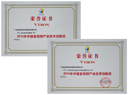 Ark多屏處理器獲得“2014年中國音視頻產業技術創新獎”,VTRON公安高分可視化指揮平臺獲得“2014年中國音視頻產業應用創新獎”。