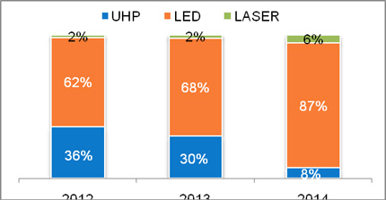 [投影之窗消息] 如今,LED光源在顯示領域備受青睞,無論前投、背投,還是平板、箱體,LED光源的身影無處不在。2014年LED光源產品銷量占到了87%,已經成為DLP拼接單元的標配。UHP光源產品仍占銷量的8%,在一些低端項目中仍有應用,隨著UHP光源光機的停產,預計未來1-2年將被其他產品所替代。