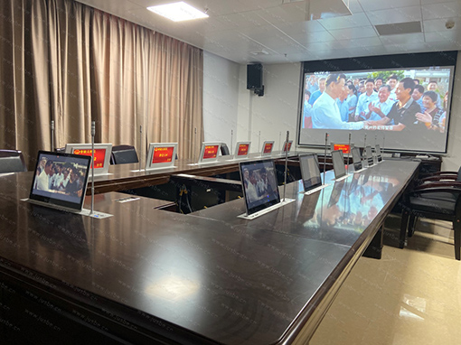 會議室作為溝通、決策的議會要地,設計的無紙化會議系統管理平臺,按會議室布局,配置了14點位的1080P高清液晶雙顯帶話筒升降一體機,可提供會議通知、會議發布、會議簽到、投票表決、同屏批注、投影、視頻播放、交互式電子白板、語音轉文字識別、呼叫服務、一鍵文件加密歸檔等豐富的會議服務功能。