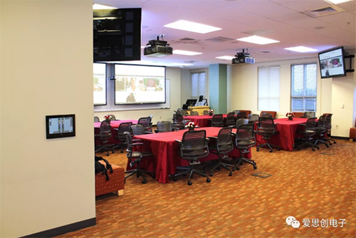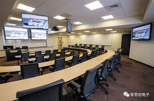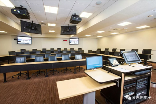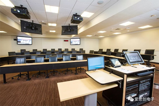 平板顯示器。電腦、實物展臺或媒體播放器等信號源設備,以及視音頻設備分別被安裝在房間后方的 IDF