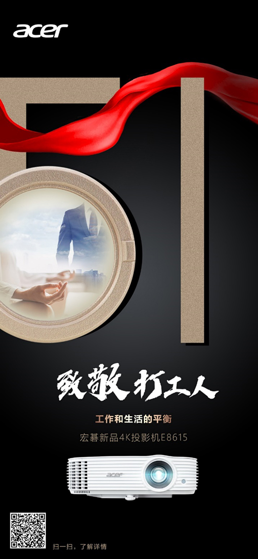 勞動最光榮!即將五一國際勞動節之際,宏碁投影火熱上新4K投影機E8615,以此致敬光榮的打工人!宏碁(Acer)4K投影機E8615,UHD4K分辨率830萬像素畫質細膩,4000ANSI高流明智能光感白天直投,不僅支持HDR,更有ColorBoost