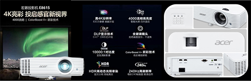 真4K炫彩畫面,4000流明高亮度,HDR高動態關照暈染,240Hz高刷新,無論白天直投的商務會議,還是居家的超高清觀影游戲,宏碁(Acer)全新4K投影機E8610,都能滿足工作與生活的平衡! |