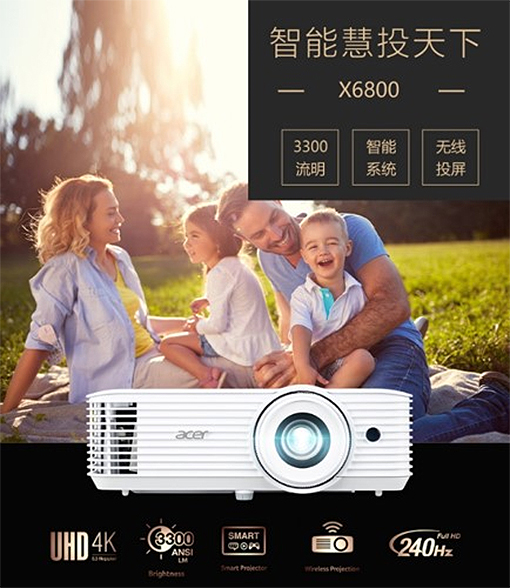 真4K超高清畫面,3300流明高亮度,自帶安卓智能電視系統的智能4K家用投影機X6800,以及3600高流明亮度有Acer