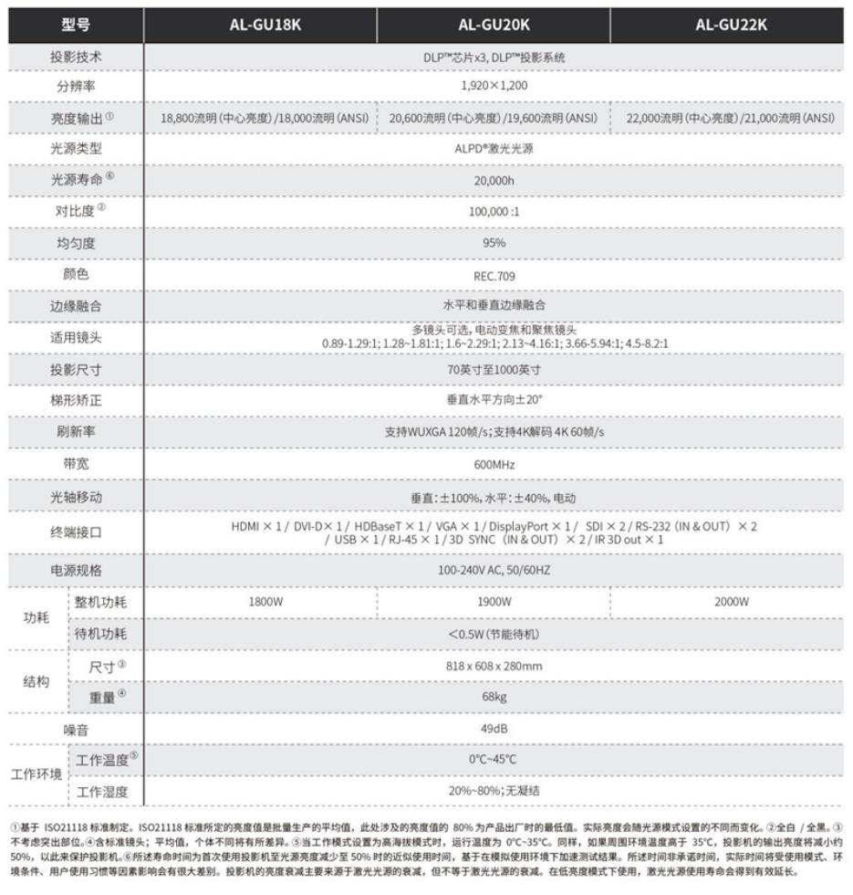 本次推出的G系列新品包含AL-GU18K、AL-GU20K與AL-GU22K三款機(jī)型,基礎(chǔ)參數(shù)方面分別對(duì)應(yīng)18800lm、20600lm與22000lm中心亮度,填補(bǔ)了光峰工程產(chǎn)品矩陣在這一亮度區(qū)間的空白。