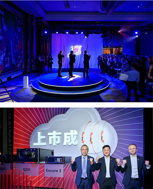 新品揭幕儀式上,王紅波先生、顏達龍先生與Domien先生站在“真”字圓形舞臺上,一同彎弓搭箭,發出萬鈞之擊,象征著三款新品、三份信心、三份承諾,直指中國投影市場及沉浸式體驗市場,三箭齊發,紗幕應聲而落,宣告I600、QDX與Encore3三款新品上市成功,為市場注入創新活力,彰顯行業領先地位。