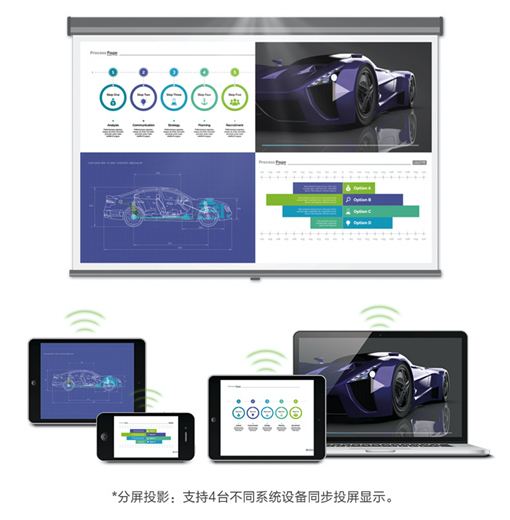 無線投屏也再度升級。全平臺無線投屏可以通過強大的四分屏功能展現,不止同時切分四個屏幕,每個分屏可以通過不同設備無線接入,例如Android、iOS、macOS、Windows同時上陣,開會可以隨心所欲地攜帶設備。