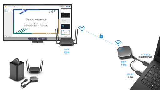 明基應(yīng)答秀作為一款真免驅(qū)無線投屏器,包含1個接收端和2個發(fā)射端,發(fā)射端連接到筆記本電腦,通過HDMI獲取音視頻信號傳輸?shù)浇邮斩,再由接收端傳輸(shù)酵队皺C(jī)、會議平板等顯示設(shè)備上。應(yīng)答秀發(fā)射端只要插入電腦接口,即可實現(xiàn)無線傳輸,通過硬件解碼,整個過程無主動或被動驅(qū)動運行,在市面上的投屏器中屬于鳳毛麟角。針對目前市面上以Mac為主流的輕薄本,明基還專門推出了Type-C接口的產(chǎn)品,方便客戶使用,而無需采用轉(zhuǎn)接口。