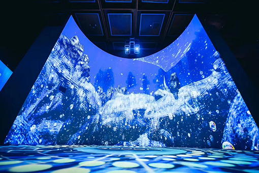 在時下的一些多媒體藝術展中可以看見此類趨勢。在北京舉辦的“深海之光”沉浸式藝術展中,一整個甬道空間都被營造成如夢似幻的深海世界,而行走其中的人們可以通過觸摸畫面來與“深海”里形形色色的生物進行互動,激光工程投影機搭配頂級燈光和音響設備,營造不止視覺的多方位感官體驗。