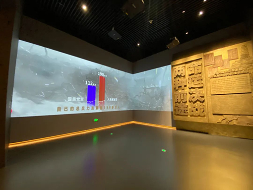 1948年9月,中共中央、中央軍委根據人民解放戰爭形勢發展,審時度勢,抓住戰機,決定發起淮海戰役。11月6日至次年1月10日,華東、中原兩大野戰軍和華東、中原、華北的地方武裝共60萬指戰員,堅定貫徹中央的決策部署,發揚高度的革命積極性和主動性,在人民群眾的傾力支持下,勢如破竹,摧枯拉朽,戰勝了80萬國民黨軍精銳部隊,取得了淮海戰爭的偉大勝利,創造了中國革命戰爭史上以少勝多的奇跡。展廳空間中通過實物、場景、人物雕塑、多媒體設備等多種進行展示,將戰爭勝利的過程生動展示在了觀眾的面前。