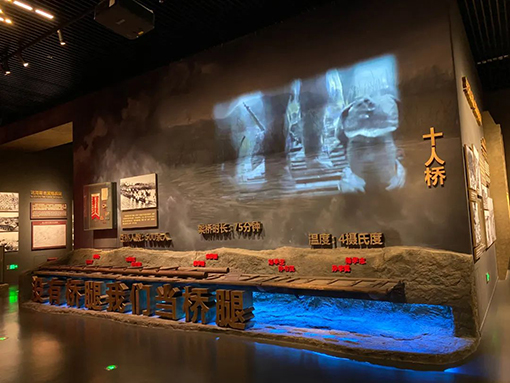 淮海戰役中的“十人橋”在這里進行了一次體驗式的場景還原,觀展人員幾人合力才能抬起充當橋面的厚重木板,木板下面是4攝氏度的冰板,模擬當時河水僅為4攝氏度時,寒氣順著“橋面”傳到手上,冰冷刺骨的感覺,令人追憶起革命勇士不畏艱險的奮戰精神。