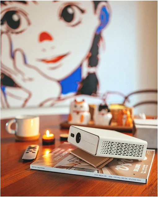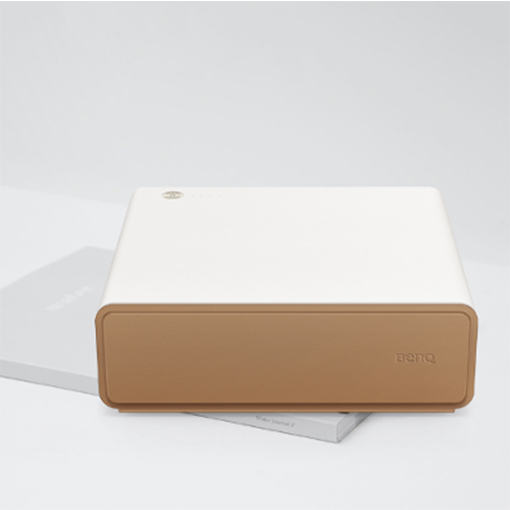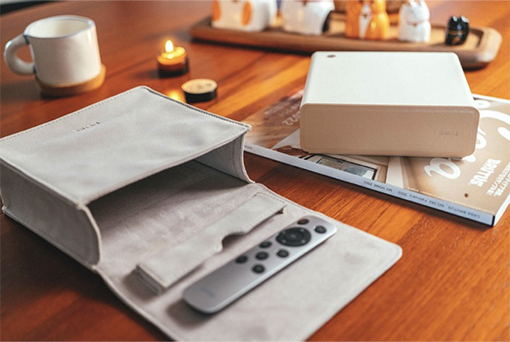 E60由明基設計團隊操刀,外觀一改以往純白商務風,而是擷取暖棕和淺金裝點,輔以柔軟的皮革中和金屬的硬朗感,達到視覺與觸覺的平衡,適用于任何場景。其皮套磁吸翻蓋既可以保護鏡頭,亦可以作為支架調節觀看角度。