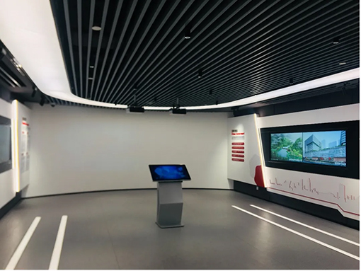 成果展示廳設計為折幕和弧幕的投影部分。設備選用佳能WUX450ST超短焦投影機4臺,其中由兩臺佳能WUX450ST投影機形成弧幕投影,重點介紹工務署的概況和投資興建場所情況,以及歷年的重大項目成果。進門處由于距離很短,選用了0.54:1的超短焦機器,短小精悍,不影響門口的形象展示,同時可以緊貼天花板,不阻擋視線和形成較好的展示內容。