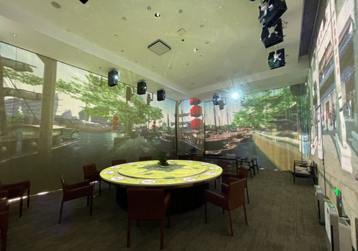 系列投影機之后,這間沉浸式餐廳為食客打造了一個非同一般的多維感知、愉悅新穎的數字化餐飲體驗空間。整個包間只設有一張餐桌,其墻壁和餐桌由虛擬影像組成