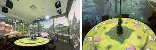 Inspire 系列投影機安裝在貴賓包間的天花板上(左);顯示在桌面上的栩栩如生的動畫視覺效果(右)