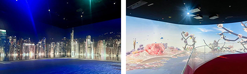 廣東美術(shù)館(左)和廣東文學(xué)館(右)通過全景曲面屏幕上的沉浸式投影,展現(xiàn)了豐富的文化遺產(chǎn)