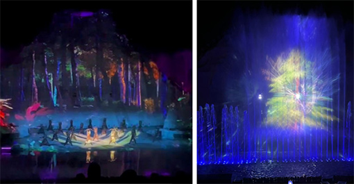 演出現(xiàn)場(chǎng),演員與山體上的宏大投影(左側(cè))以及水幕上的投影(右側(cè))交相輝映,令觀(guān)眾如癡如醉
