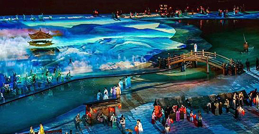 WU激光投影機以其40000流明的中心亮度參與對紗幕進行投射,使得場地中央出現了絲綢與地面的沙漠相連,駝隊、商人在“沙丘”上前行的精彩場景。