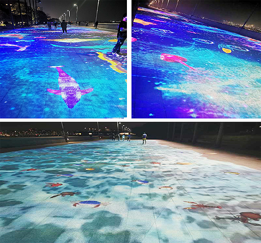 本次錢江新城錢塘江岸投影項目完美展現了地面、沙灘、大海、雷達的互動效果,展示尺寸達到長100米、寬12米,為杭州市錢江新城景觀亮化工程中,科技與藝術、人文與生態,注入了新的詮釋,也為杭州市民的夜生活增添了必游之地。