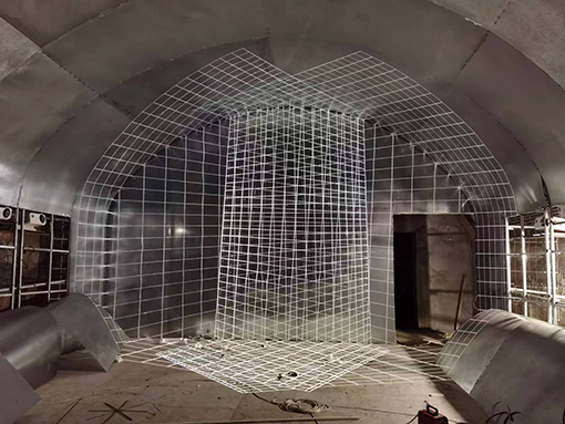 Laser系列投影機18臺,實現了高難度的防空洞內隧道型沉浸式投影,圓弧形頂的表面不規則投影面積,寬達6.5米,高5米,深16米。星際避難所、地下城避難區、星際逃生區……
