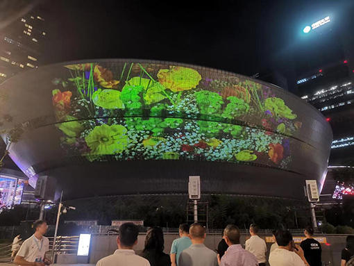 [投影之窗消息] 傍晚的成都天府大道,光影交錯,流光溢彩。走出孵化園地鐵口,一幅精美的巨幕投影畫面隨即映入眼簾,吸引了不少行人駐足觀看、拍照打卡。這塊成都新增設的景觀照明藝術裝置于成都大運會倒計時一周之際正式啟用,滾動播放《大運成都公園城市歡迎您》《哪吒蓉寶奇遇記》《空中看大運·動感大運》《煙火成都&麻辣大運》等大運主題宣傳短片,可愛的蓉寶呼之欲出,助力營造出“全民參與大運、共享大運”的熱鬧氛圍。