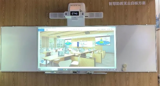 傳統(tǒng)教學模式中的“粉筆+黑板”組合看起來似乎已有些過時,愛普生與合作伙伴一起,推出了更智慧化的助教無塵白板方案。投影機將課件畫面投射在白板上,老師可以對課件內(nèi)容進行圈點批注、擦擦寫寫,存在云端的筆記和資源也可以同步進行投影。兩側(cè)白板上的書寫內(nèi)容亦可通過投影機同步顯示在投影畫面中。