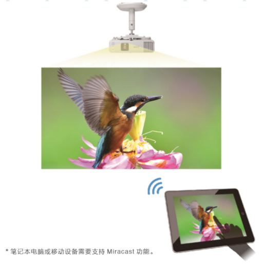 功能,可以將移動設備或筆記本電腦中的內容直接鏡像至投影屏幕,無需任何連接線便可實現高清信號的傳輸。即使投影機安裝在高處,也無需“登高爬低”,隨手既能打造“新”店面,真正做到店鋪“裝修”隨心動。