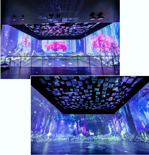 在此次智慧沉浸展中,讓人一走進(jìn)來就感到無比震撼的,絕對要先說到由12臺(tái)12,000流明*1*2愛普生激光工程投影機(jī)CB-L1505搭配ELPLM15鏡頭打造的三面環(huán)繞沉浸式投影。該方案在3面墻上各采用了4臺(tái)CB-L1505投影機(jī),超大的高清畫面,讓游客仿佛置身于奇幻世界之中,伴隨著畫面中不斷變換的美麗景色,感受奇幻的觀影樂趣。