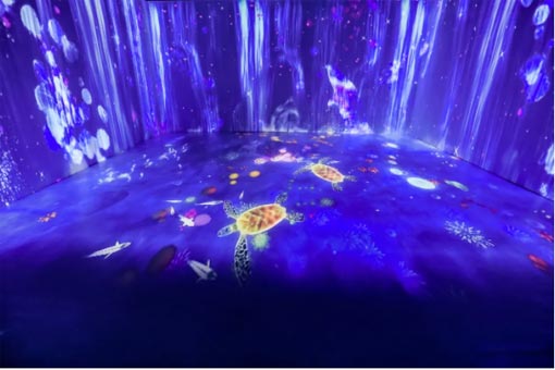 光影藝術(shù)的魅力不僅是能帶給游客如夢似幻的全新“視界”,更能將光作為互動(dòng)的媒介,讓游客能全身心沉浸在光影視界中。游客只需踏入其中,腳下地面就會(huì)跟隨游客的腳步變換畫面,而這種奇妙的體驗(yàn),得益于8臺(tái)12,000流明*1*2愛普生激光工程投影機(jī)CB-L1505UHNL搭載ELPLW05鏡頭實(shí)現(xiàn)。
