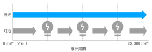 上述時間為非承諾保修時間。激光光源亮度將隨使用時間的增加而逐漸降低。激光光源實際使用壽命受使用模式、環(huán)境條件、用戶使用習(xí)慣等因素影響會有很大差別。投影機(jī)在低亮度模式下使用,激光光源使用壽命會得到有效延長。