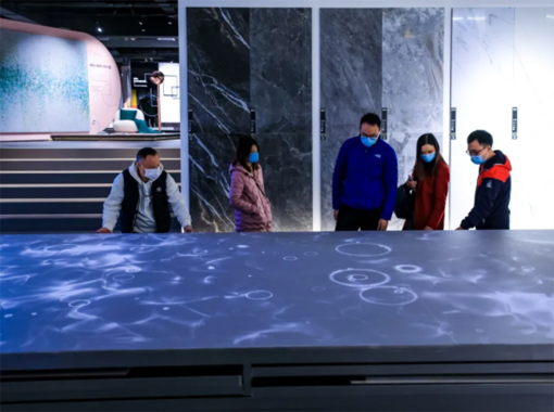 展廳中庭有3面陶瓷質地的展示桌面,分別由3臺6,000*1*2流明的愛普生激光工程投影機CB-L1060UNL搭配ELPLU03鏡頭組成,中庭的設計融入了設計師大高啟二的“五感”設計理念,桌面伴隨著小魚游走,以及現代感十足的線條畫面,為參觀者提供樂趣,產生感懷,營造“心動空間”。