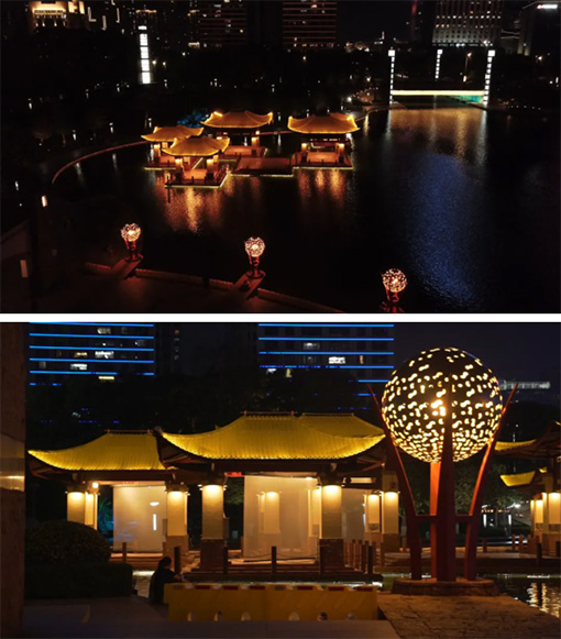 千燈湖北區禪湖區域的每座橋都做了不同的亮化處理,其中最具特色的便是千燈湖三期三孔橋,設計團隊依據三孔橋的橋形安裝了數字水簾。數字科技結合光與水形成不同形狀、不同色彩的水之景觀藝術。