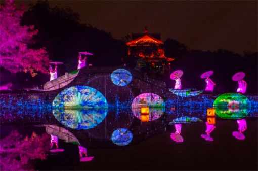 在杭州西溪濕地洪園,浙江科通數藝科技有限公司利用愛普生激光工程投影機打造出一部江南美學浸潤大戲——《今夕共西溪》。在傳統戲劇舞蹈演出中融入“全息投影”等創新視覺技術,通過“視”、“聲”、“意”的藝術呈現與“行浸”、“演”一體的瀏覽風格,為游客帶來一場視覺盛宴!