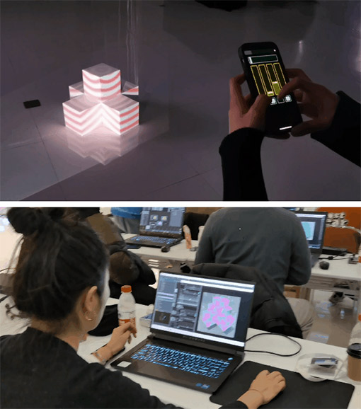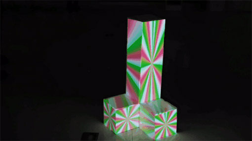 [2]可操作性,多角度的安裝,不用局限在單一平面,通過多臺投影的圖像拼合疊加,讓現(xiàn)實世界的物體“穿上”變幻多端的光影。
