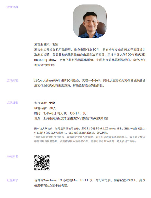 課上不僅會有TEA新媒體社區(qū)講師教授大家使用TouchDesigner多媒體互動制作,還有愛普生中國團隊分享投影設備選材、投影流明、多臺融合等方面的權威經(jīng)驗。