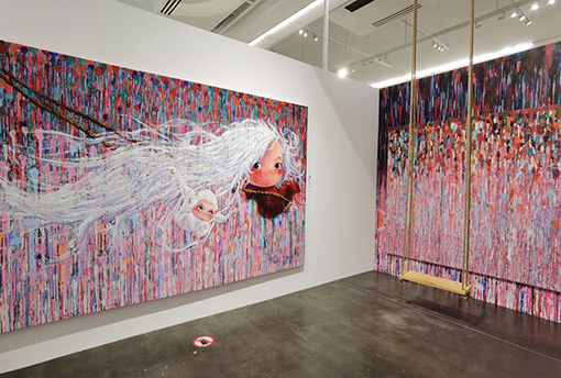 漫步于館內(nèi),畫(huà)作的整體風(fēng)格與如花的形象由一開(kāi)始的陰郁、沉悶逐漸轉(zhuǎn)向活潑、狂放再到美好、詼諧,向觀者傳遞了創(chuàng)作者內(nèi)心情感的變化。不僅如此,作者在創(chuàng)造這些虛擬景物時(shí)更是將現(xiàn)實(shí)融合進(jìn)去,使用了木屑、咖啡等物質(zhì)糅合進(jìn)畫(huà)作中,形成了一種飽含“元宇宙性質(zhì)”的概念。