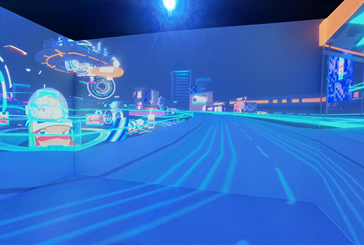 7000流明高清投影機(jī)所打造,4周墻面分別由一臺(tái)投影機(jī)單獨(dú)投射畫(huà)面,地面則以2臺(tái)投影機(jī)進(jìn)行畫(huà)面融合。